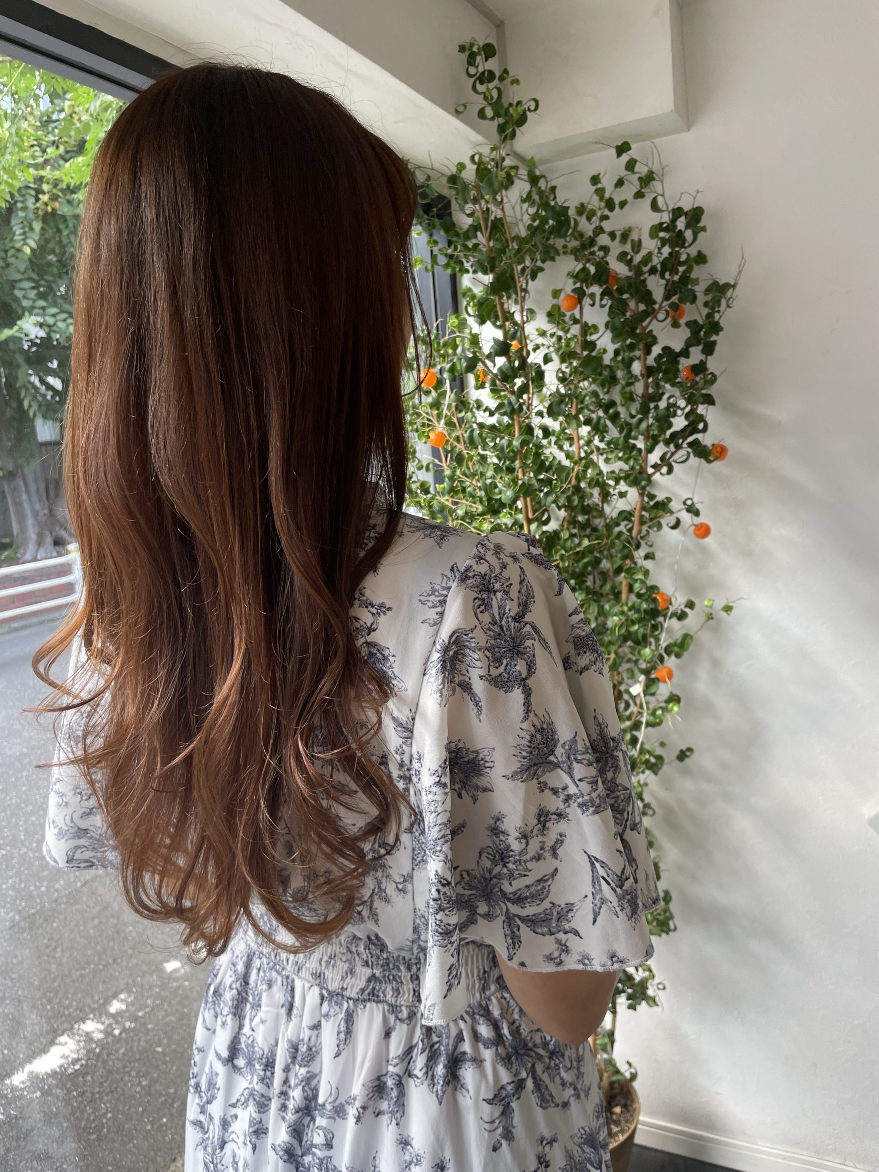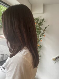 髪はピンクブラウンにトーンダウン。